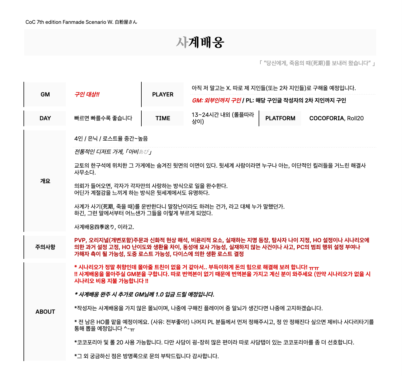 제가 실수한 점이 있어 덧붙입니다: GM님께 시날 시작 전에 1.0 -> 완주 후에 추가로 1.0 [X]/시날 완주 후 1.0 [O] (그냥 추가로라는 말을 없다고 생각해 주세요... 지우는 걸 깜박했습니다.)