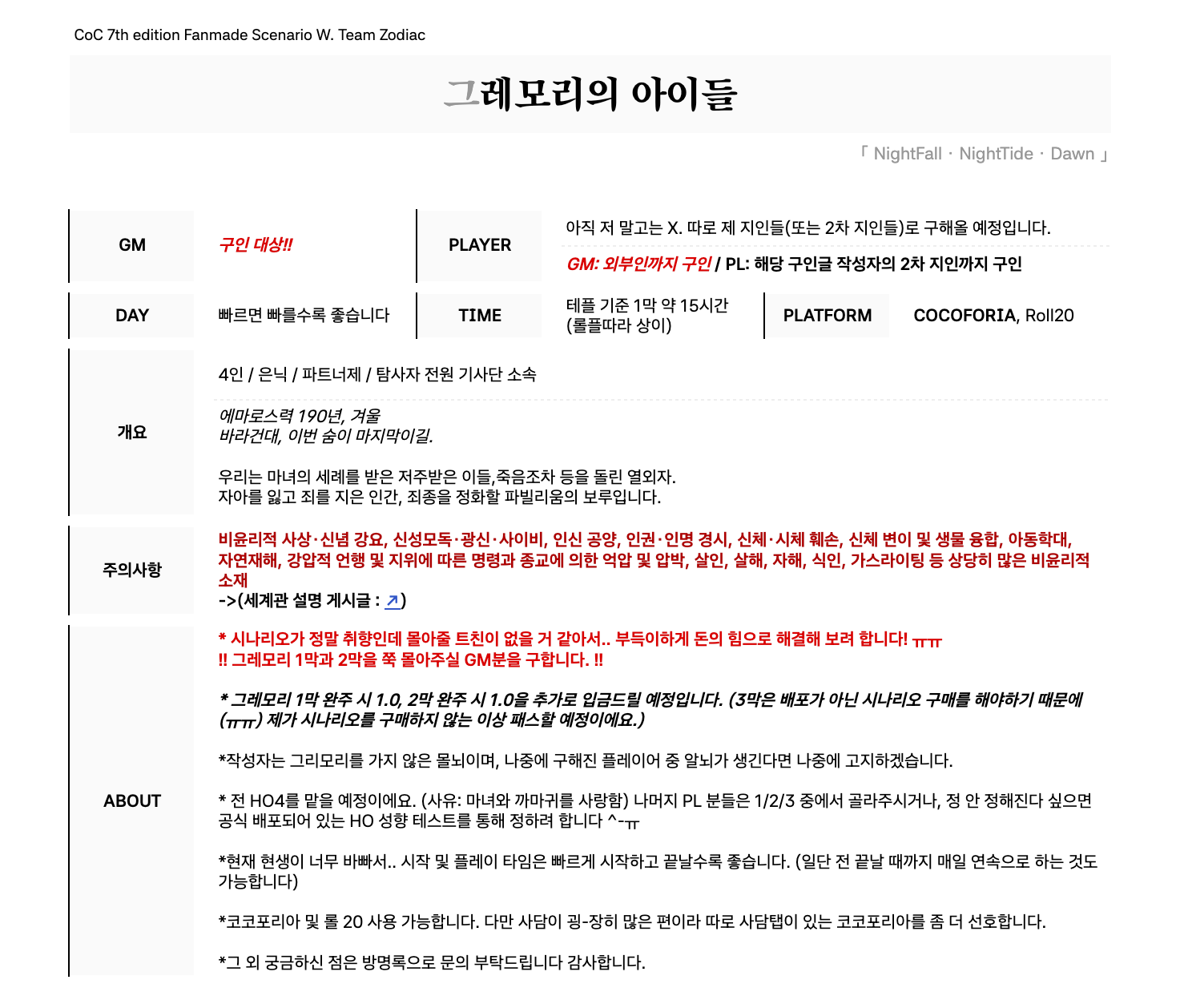 COC<그레모리의 아이들> 세계관: Team Zodiac